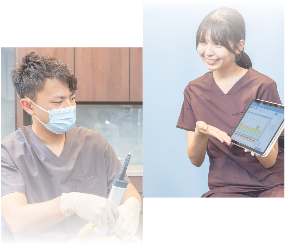 虫歯や歯周病が進行したときのリスクについて、動画や写真を用いた視覚的に分かりやすい説明を行います。また、適切な検査により根本原因を特定し、あなたに合った予防・メンテナンスのプログラムをご提案いたします。オーダーメイドの予防プログラムに加え、患者様が納得した上で予防ケアに取り組むこと、予防の効果を最大限に高めることができます。