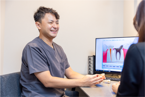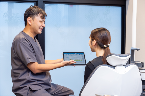 初診時に行った検査結果を患者様と共有し、現在のお口の状態について説明いたします。お口にトラブルがあった場合、症状が進行するとどうなるのか、病気がもたらすリスクについて、アニメーションなどの視覚的に分かりやすい資料を用いて患者様にわかりやすくお伝えします。検査結果をもとに治療計画を立案し、治療内容や治療の流れを患者様と共有いたしますので、わからないことがあれば何でもご質問ください。