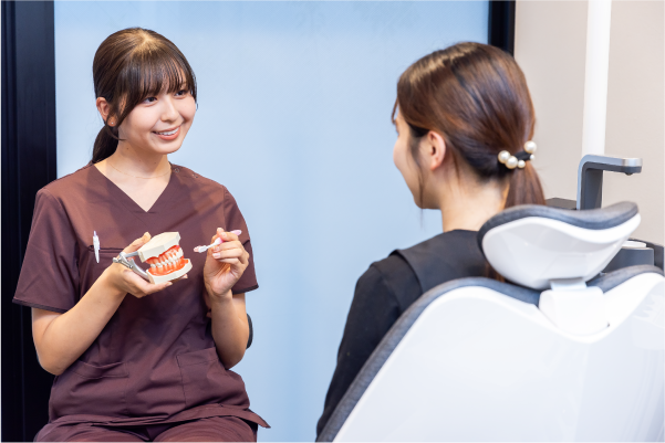 ご自宅でのセルフケアをしっかりと行っていただいた上で、歯科医院で歯科衛生士によるプロフェッショナルケアを受けていただき、少しずつ蓄積していく歯石などの汚れを取り除き、虫歯や歯周病を予防していきます。定期的に通っていただくことで、ご自身では気がつくことが難しい虫歯の進行や、噛み合わせの不具合といったお口の状態の変化を早期に発見することが可能です。お口の状態を患者様ご自身にしっかりと理解していただくことで、効果的な予防・メンテナンスを行うことができます。