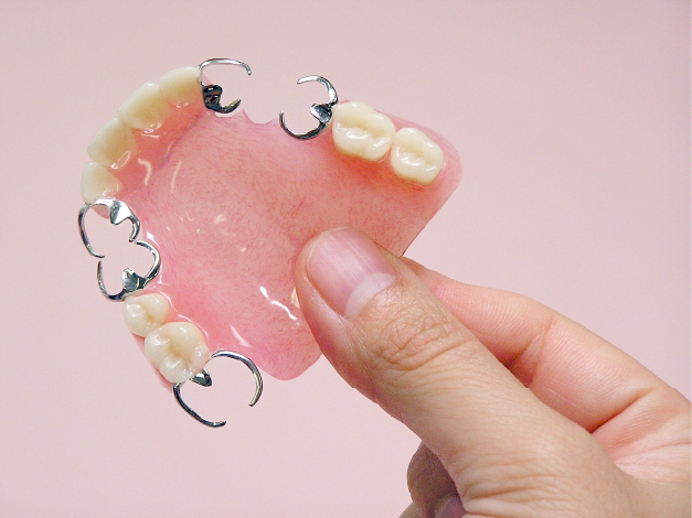 部分入れ歯は、人工歯と歯ぐきの代わりとなる床(しょう)と、入れ歯を固定する留め具で構成されています。