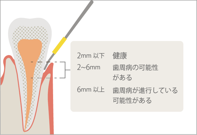 歯と歯ぐきの間の溝の深さの測定や、溝の内側を触り状態を確認します。歯周ポケットの深さ、歯ぐきの内側の腫れ、出血の有無などにより、歯周病の進行状態をチェックします。