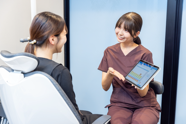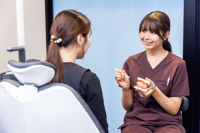 名古屋市千種区の歯医者 やまだ歯科吹上院では、患者様のお口の健康を長く維持していくために、歯周病ケアのトレーニングを積んだ歯科衛生士が、ひとりひとりに合わせたお口のサポートを行っています。治療についてわからないことがあれば、お気軽にご相談ください。歯周病のリスクや、予防・メンテナンスの重要性について丁寧にご説明いたします。
