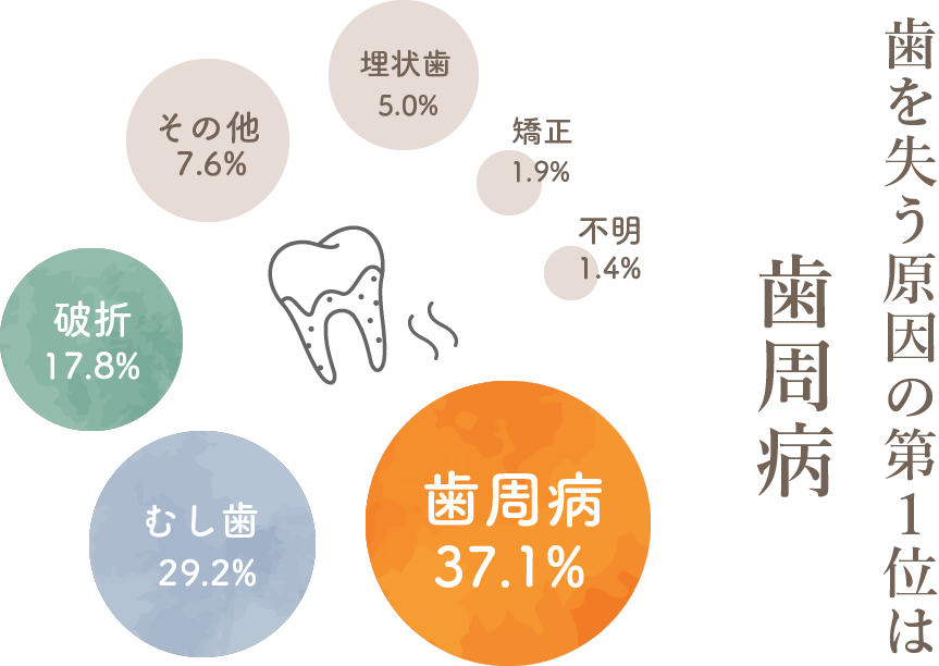 ブラッシングなどで落としきれない汚れなどに含まれる細菌が繁殖し、歯垢や歯石が形成され、歯ぐきの炎症、出血や腫れといった症状が出てきます。進行した歯周病によって歯を支える骨が溶かされ、さらに重症化すると歯を失うリスクがあります。