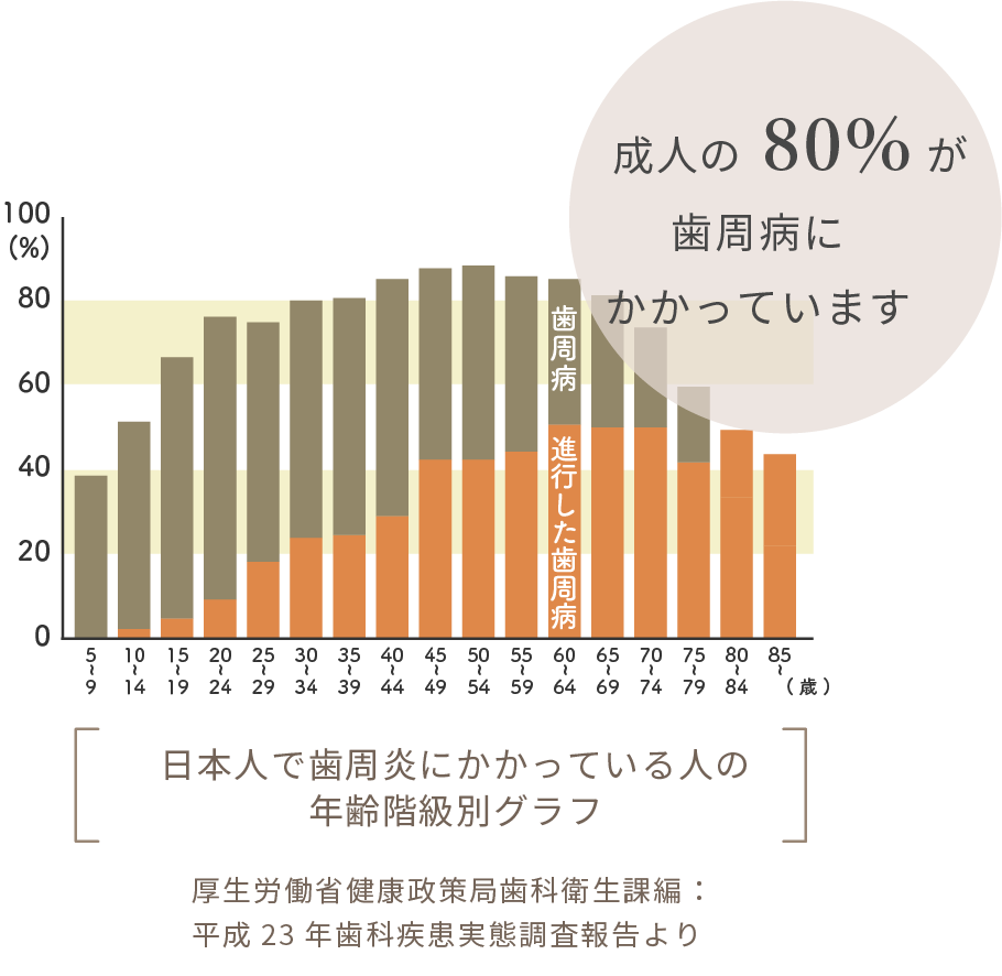 日本人の成人の約8割が歯周病にかかっていると言われており、進行した歯周病は糖尿病や誤嚥性肺炎などのリスクを高め、健康寿命にも影響を与えます。名古屋市千種区の歯医者 やまだ歯科吹上院では、患者様に歯周病に関する正しい知識と、現在のお口の状態をしっかりと理解していただいた上で、ひとりひとりに合わせた効果的な歯周病ケアをご提案します。