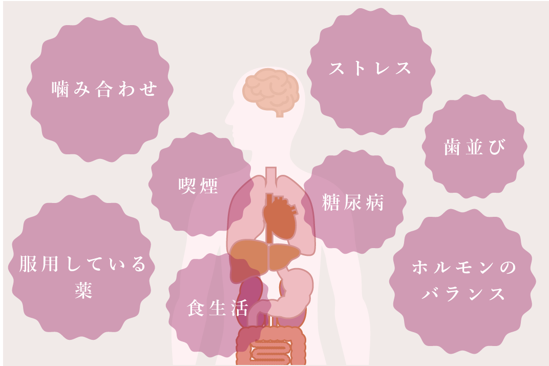 歯周病は糖尿病や心疾患などの全身疾患とも深い繋がりがあると言われています。歯並びや噛み合わせといった口腔内の不具合だけではなく、喫煙などの生活習慣やホルモンバランスの乱れから、歯周病の進行が早まってしまうケースがあります。歯周病が進行すればするほど、糖尿病や誤嚥性肺炎などのリスクが高まることが知られており、全身の健康寿命を延ばす伸ばすためにも早めの歯周病ケアが大切です。